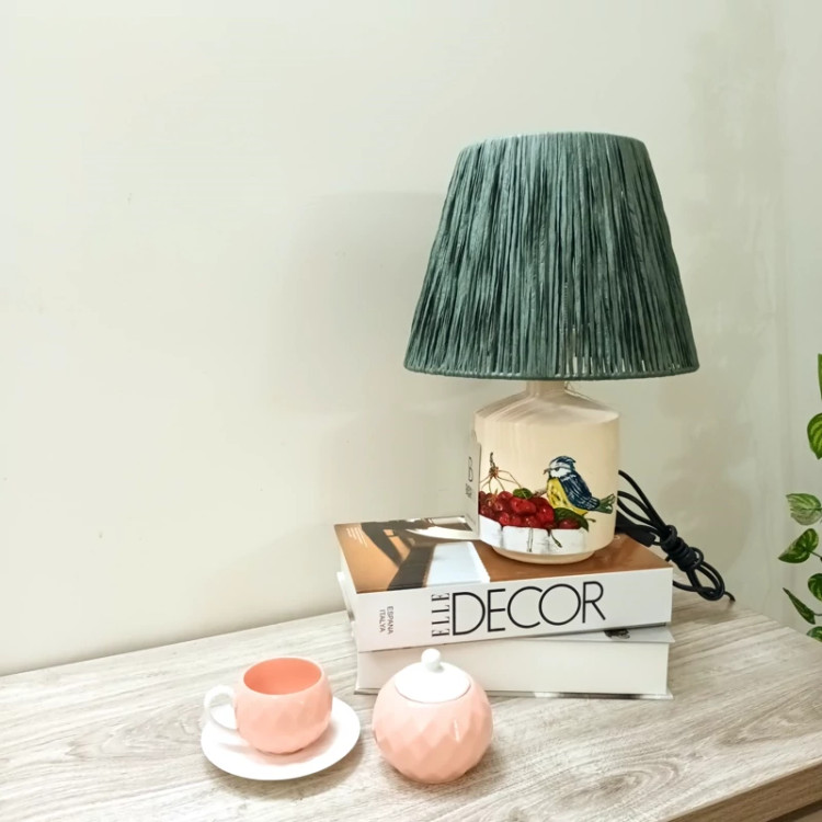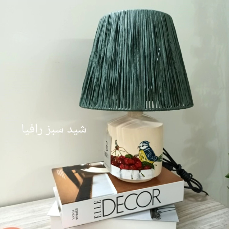 آباژور سفالی نقاشی دست مدل نغمه کوچک با شید های رافیا سبز و کرم ، انتخابی بینظیر برای علاقهمندان به دکوراسیون هنری و اصیل ایرانی است.