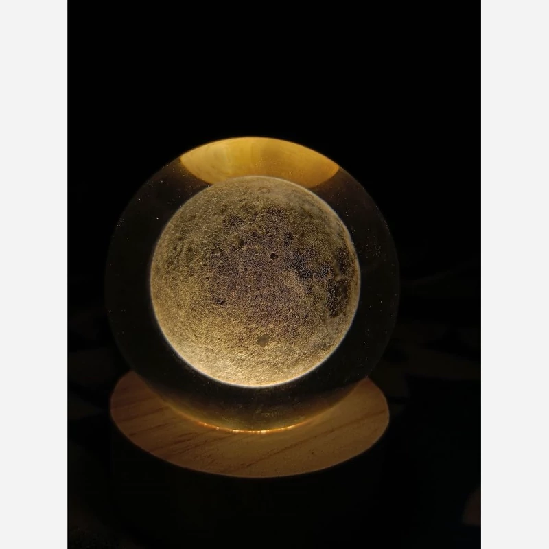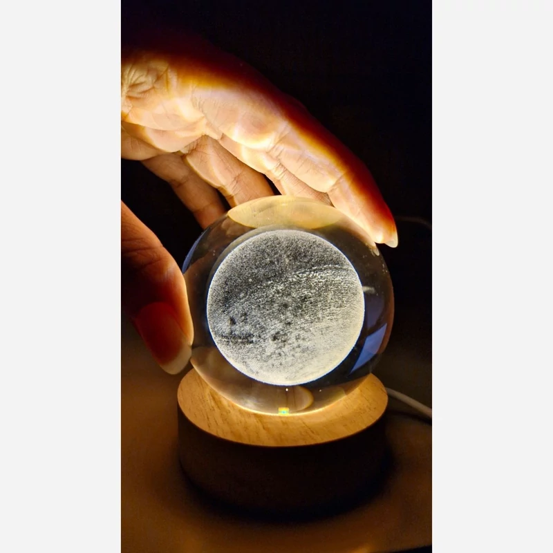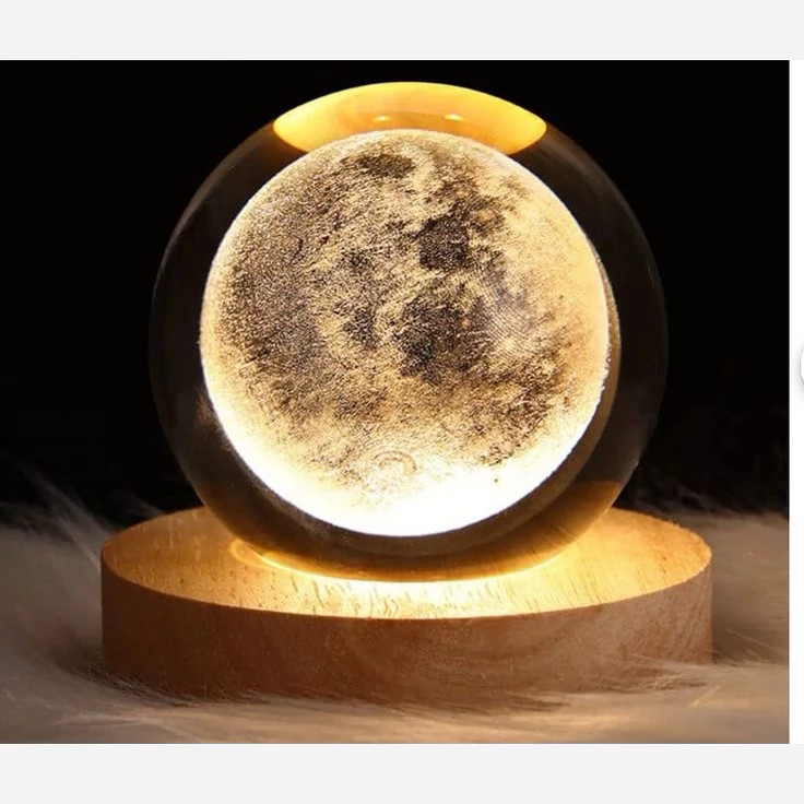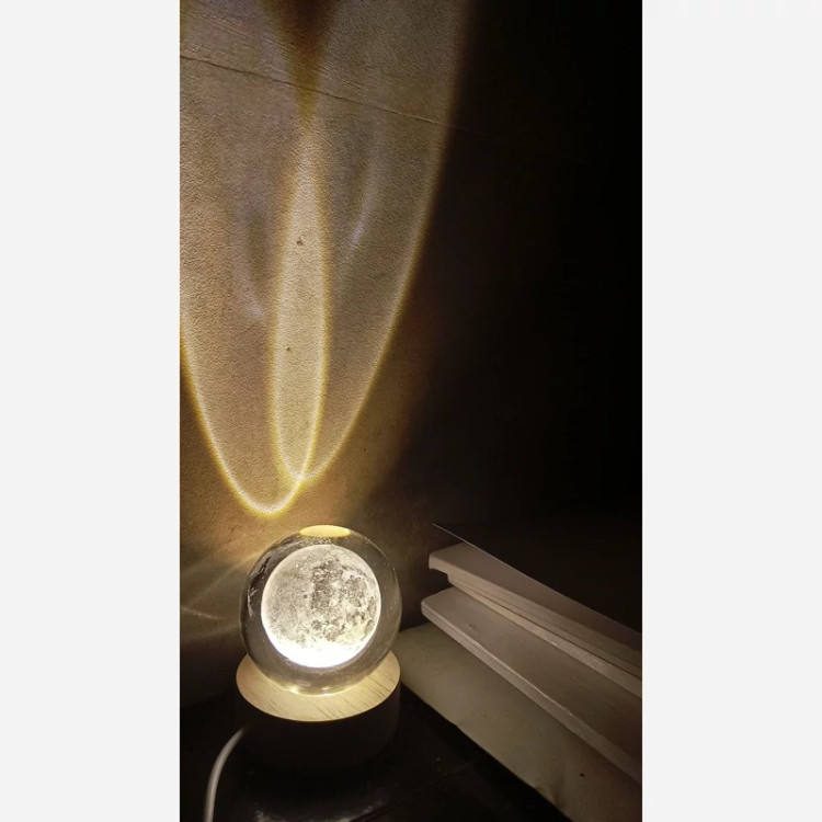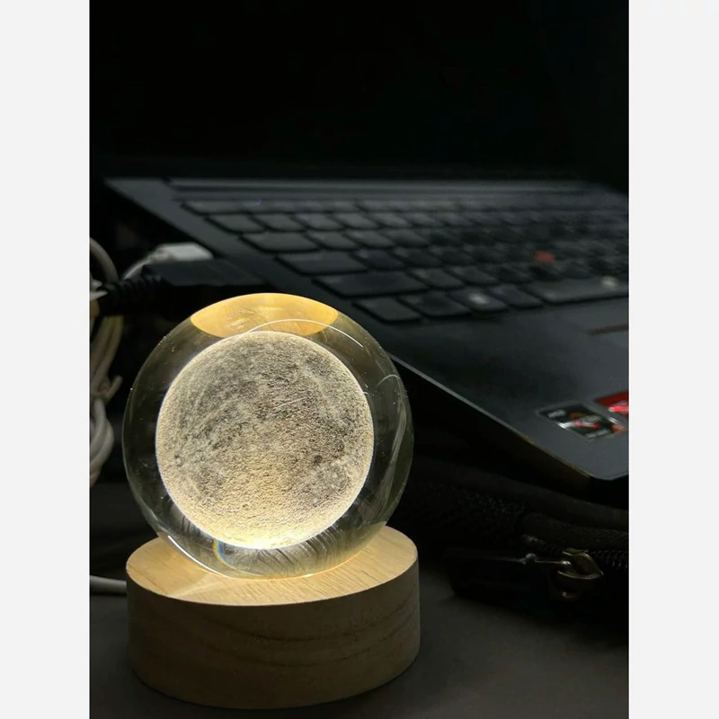 این چراغ خواب کریستالی به صورت سه بعدی و در ماه تولید شده که باعث جذابیت بیشتر اتاق خواب شما می شود. جنس این گوی شیشه ای از کریستال فشرده می باشد و همچنین دارای یک پایه چوبی و کابل برق USB می باشد که امکان اتصال به لپ تاپ، کامپیوتر، پاور بانک و شارژ گوشی را فراهم میسازد. این محصول دکوری منحصر به فرد و شیک و همچنین یک هدیه جذاب و ماندگار برای هر شخصی می تواند باشد.